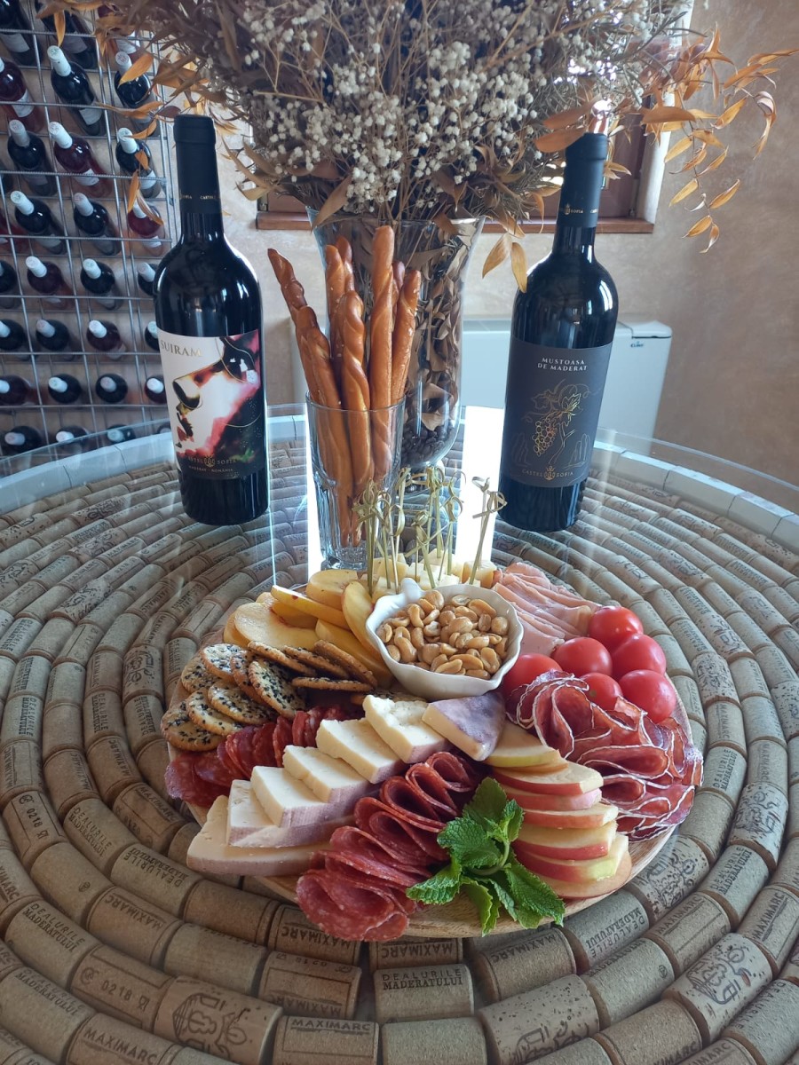 Vizită cramă, degustare 5 vinuri gamele MaxiMarc și Castel Sofia și platou brânzeturi maturate și specialității carne